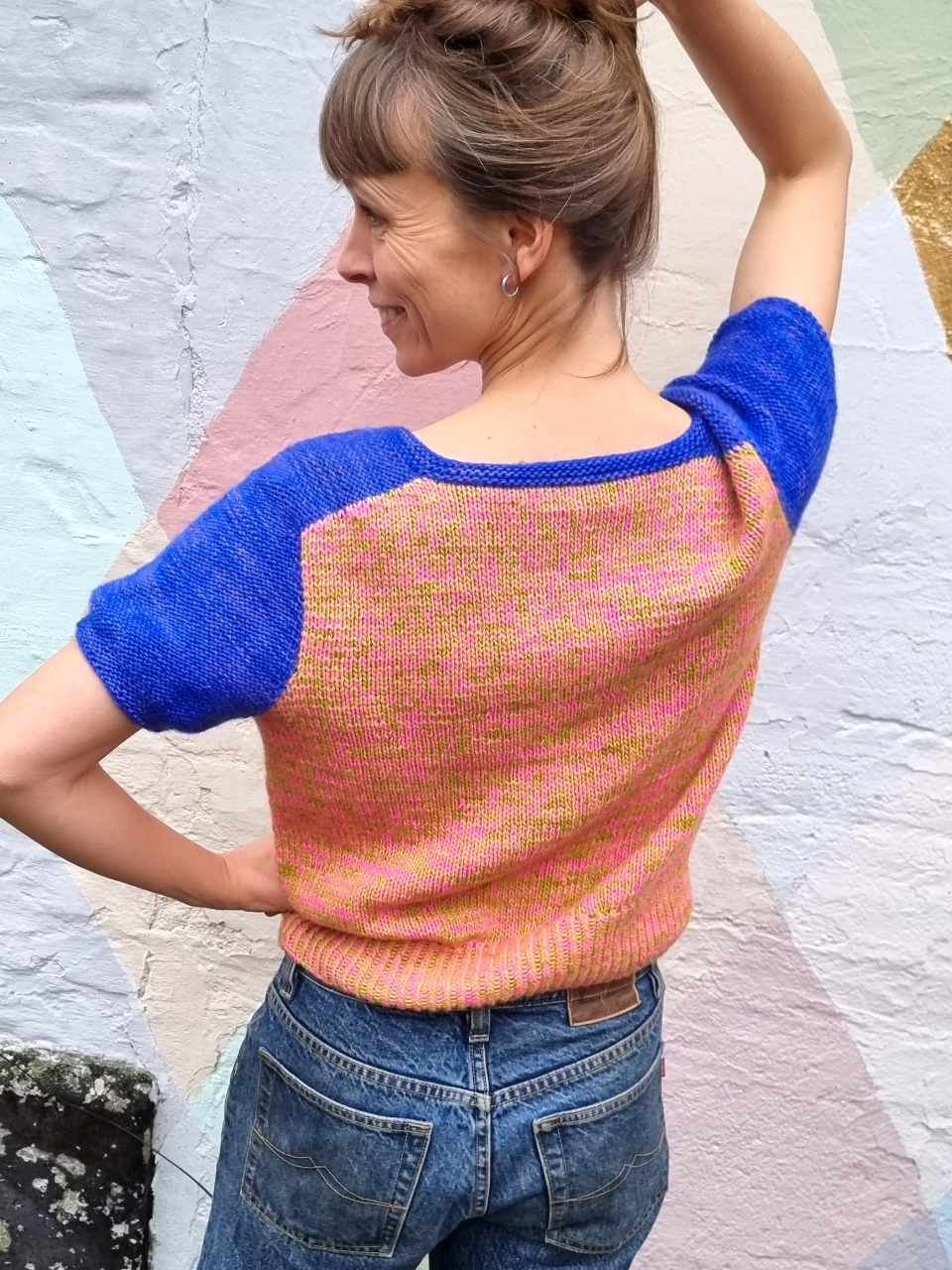 Blusen har saddelskuldre og korte ærmer, som er strikket i omvendt glatstrik, mens kroppen er strikket i glatstrik.