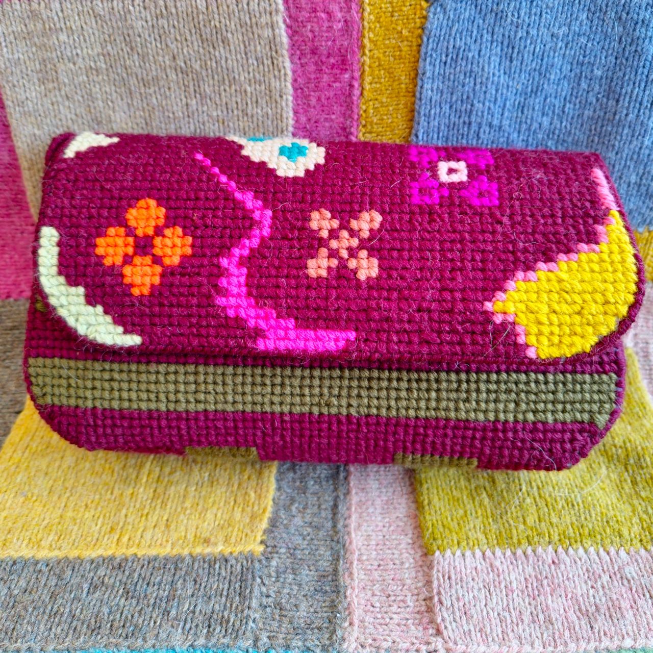 The Figuras clutch is embroidered in cross-stitch on a plastic bag template.
