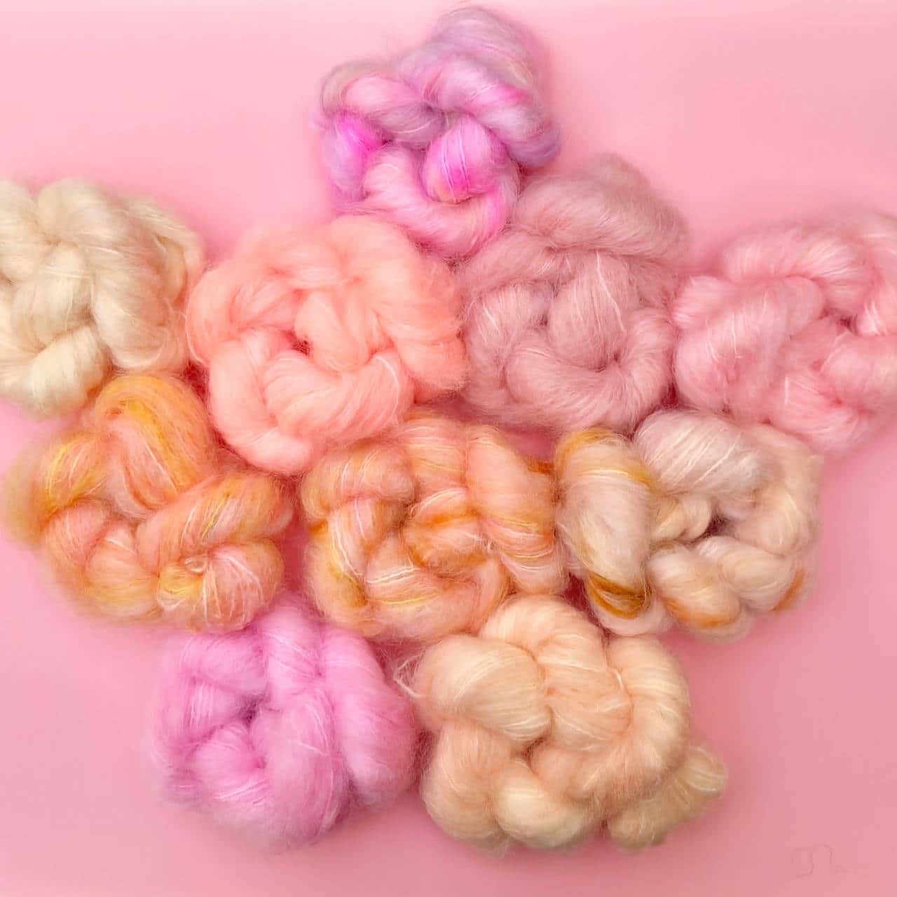 Kasse med Tyk Mohair i 10 forskellige lyserøde nuancer.