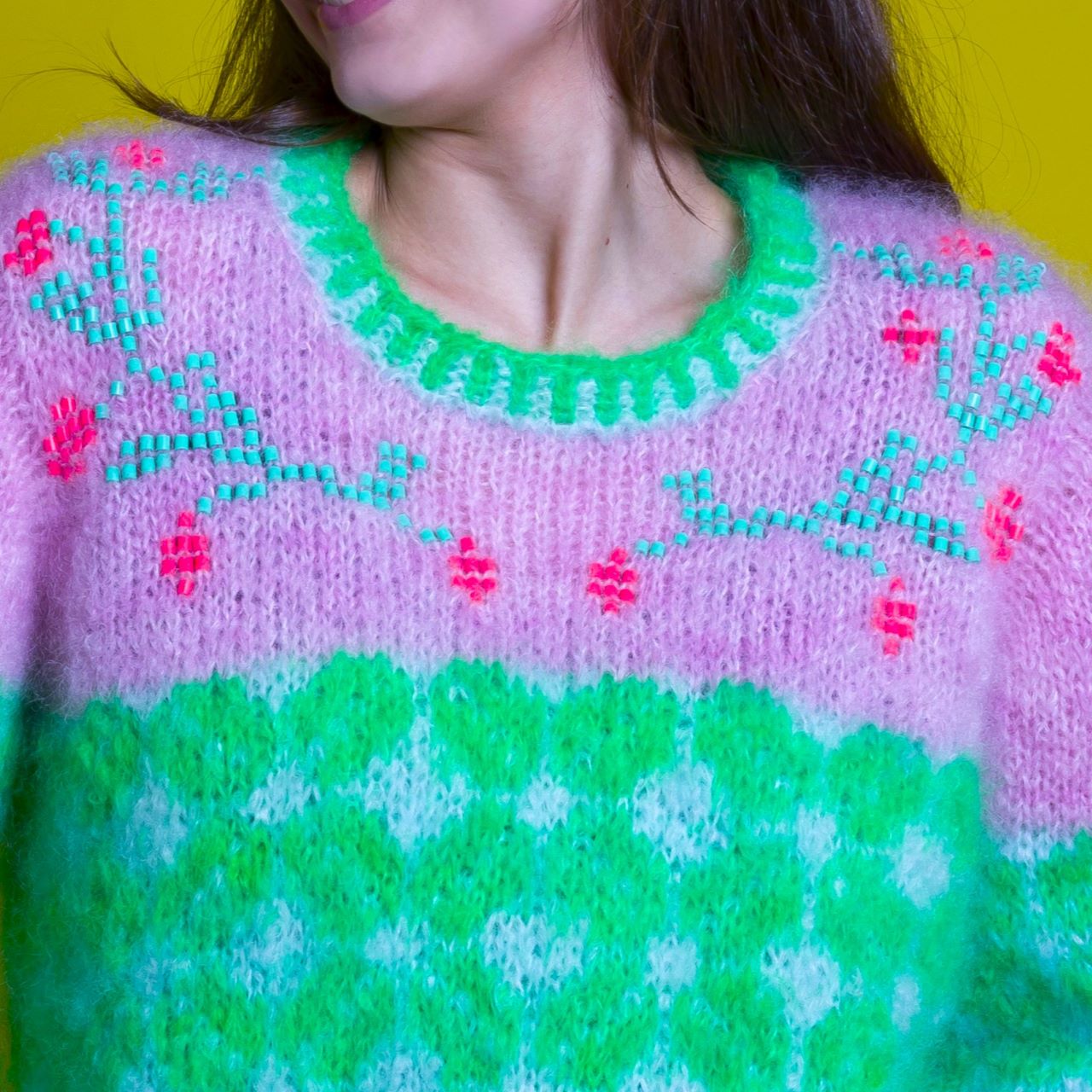 Sweaterens krop og ærmer strikkes i flerfarvestrik efter diagram, og perlerne på bærestykket påsættes løbende med en lille hæklenål.
