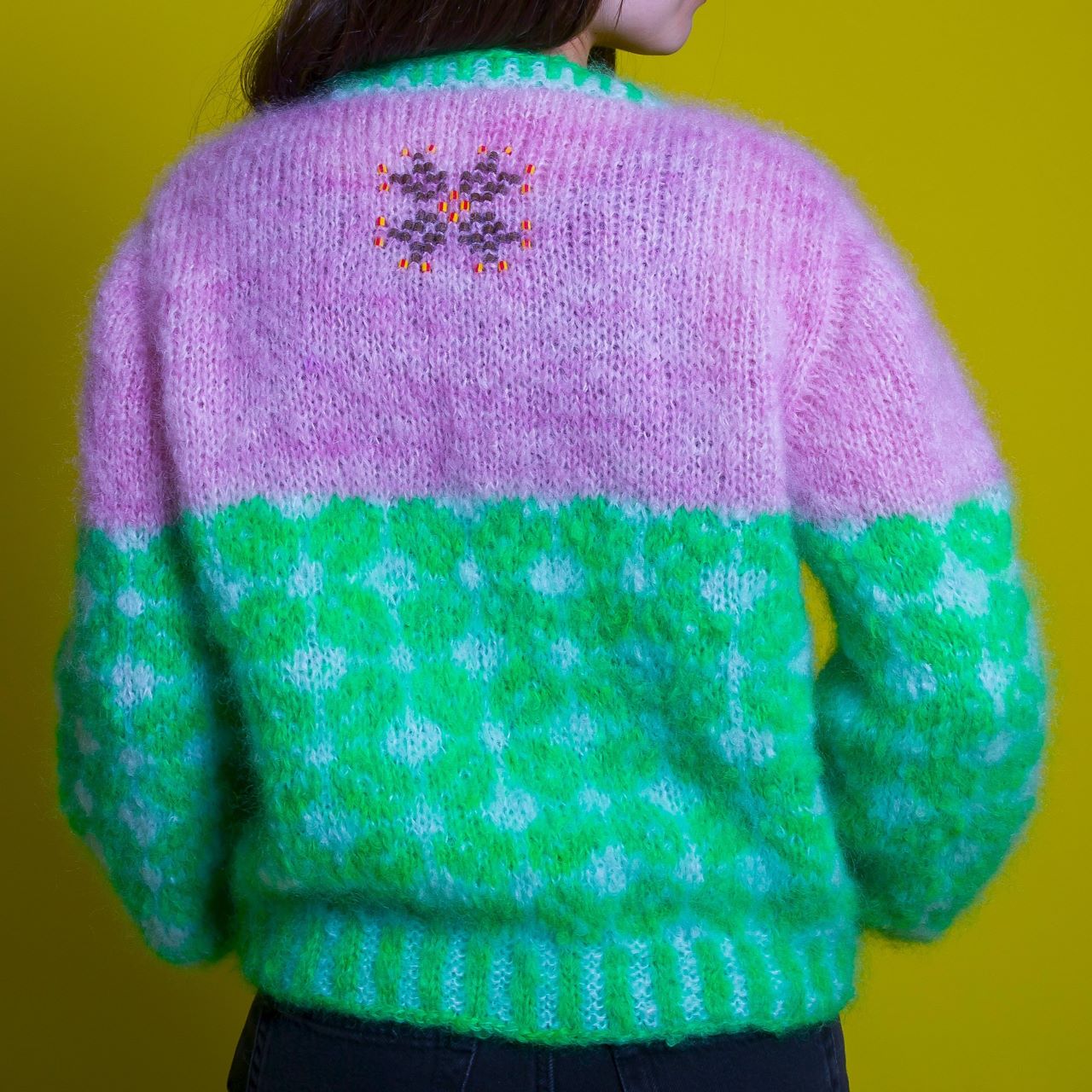 Sweateren strikkes oppefra, først øverste del af ryggen og forstykket incl. perlemotiver. Skulderne formes med vendepinde, herefter strikkes lige ned mens udtagninger former ærmegabene. Efter ærmegabene samles arbejdet og kroppen strikkes rundt i flerfarvet strik, afslutningsvis strikkes en 2-farvet ribkant. Masker samles op til ærmer, og vendepinde strikkes for at forme ærmekuplen. Ærmerne strikkes rundt, først i ensfarvet herefter i flerfarvet strik. Ærmerne afsluttes også med en 2-farvet ribkant. Til sidst strikkes en 2-farvet ribkant i halsen.