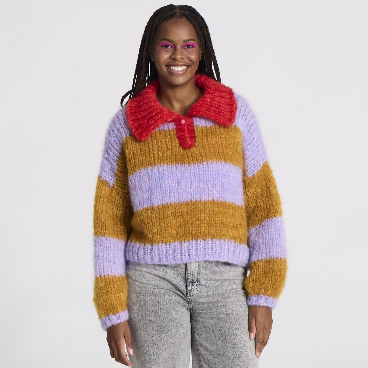 Kittet indeholder Handdyed Tyk Mohair i valgfrie farver. Knap medfølger ikke.