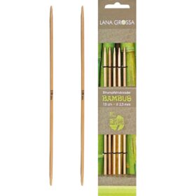 Strømpepinde i bambus fra Lana Grossa. Pakken består af 5 stk 20 cm lange strømpepinde. Bambuspindene er lette, solide og behagelige at strikke med. De har et godt greb, og den glatte overflade gør at strikketøjet glider nemt
